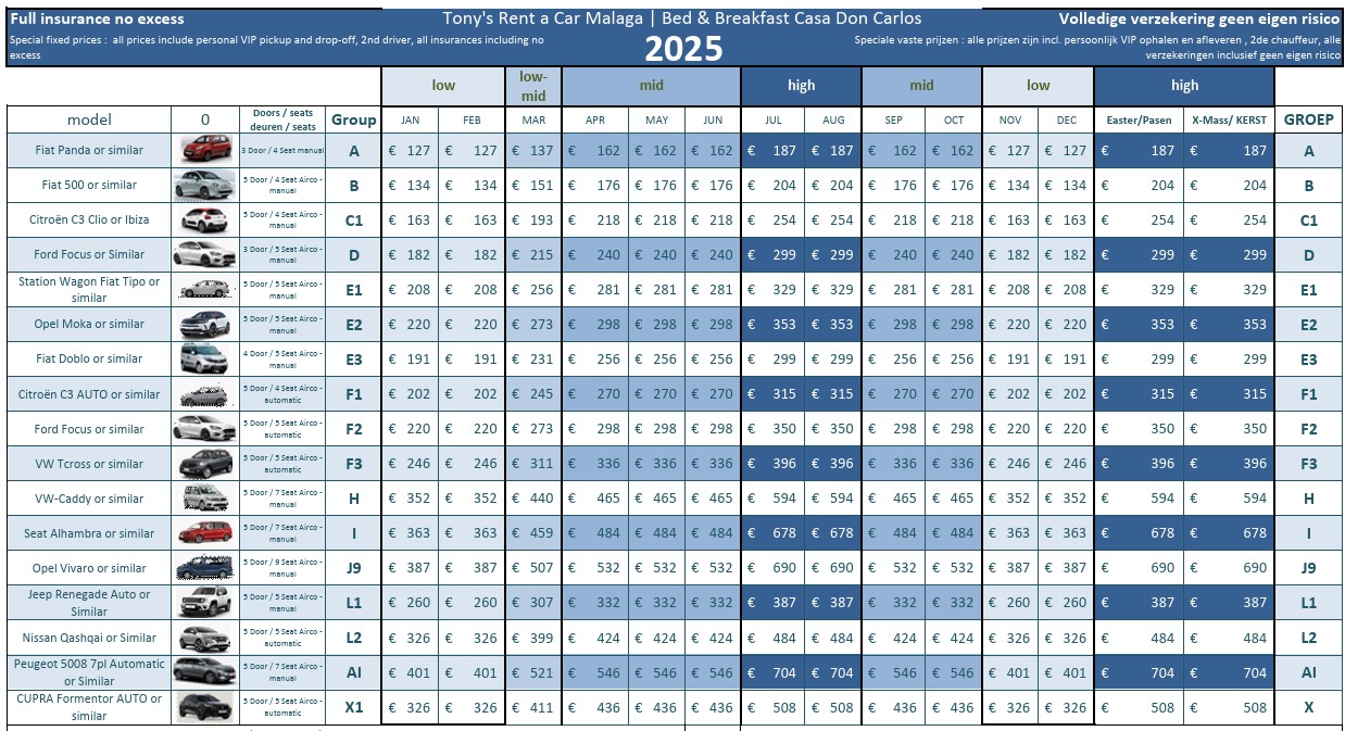 Bed & Breakfast Casa Don Carlos werkt al geruime jaren vol tevredenheid samen met het autoverhuurbedrijf Tony’s Rent a Car op het vliegveld van Malaga. Dit bedrijf is betrouwbaar en levert goede service voor een prima prijs. Als je een auto wilt huren dan kun je dit aangeven op ons reserveringsformulier. Net als met de rest doen dan de verdere afhandeling voor je.